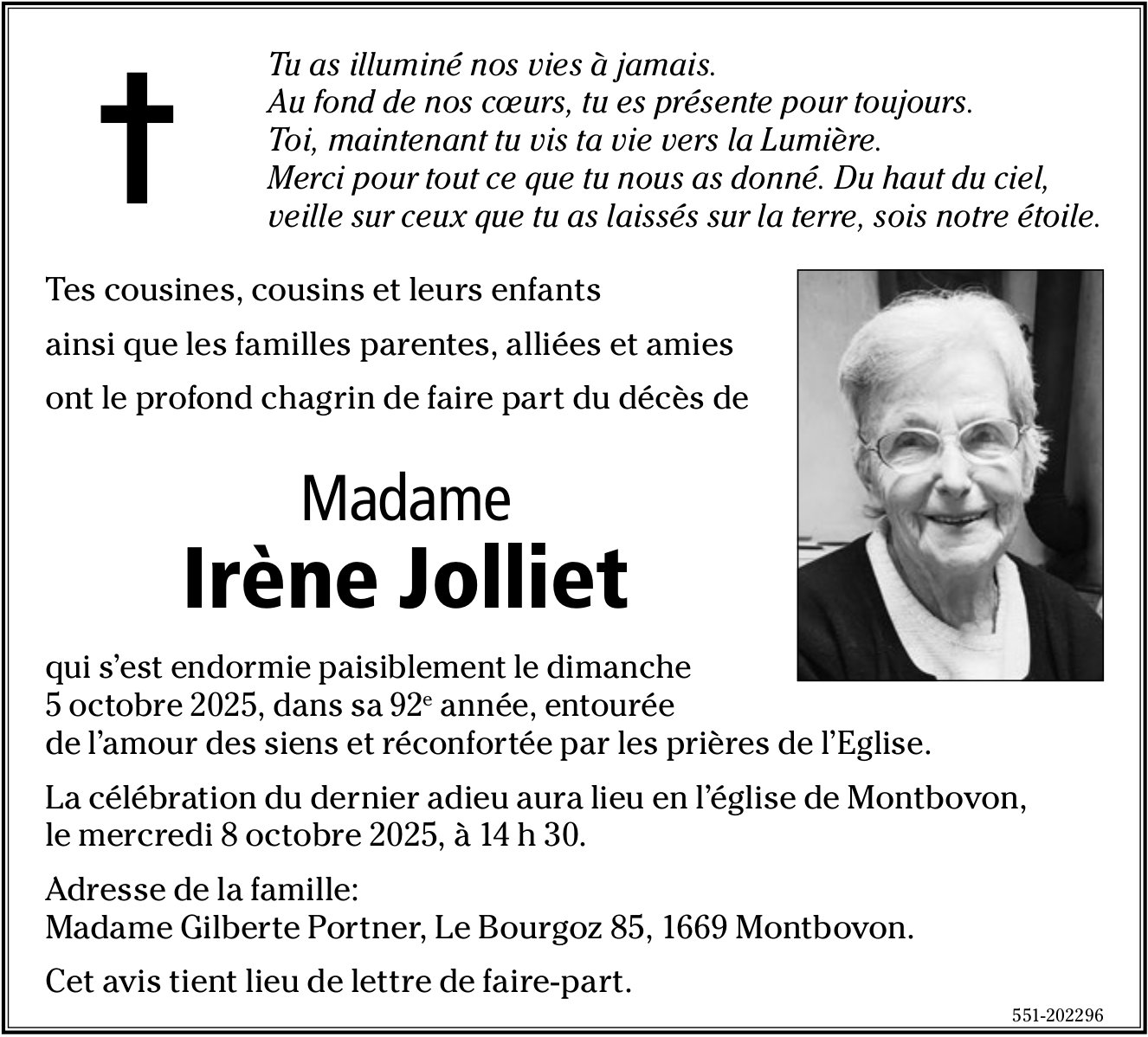 Avis de décès paru le 07/10/2025, décédé(e) à l'âge de 92 ans dans la région de Fribourg. La date de la cérémonie: 08/10/2025