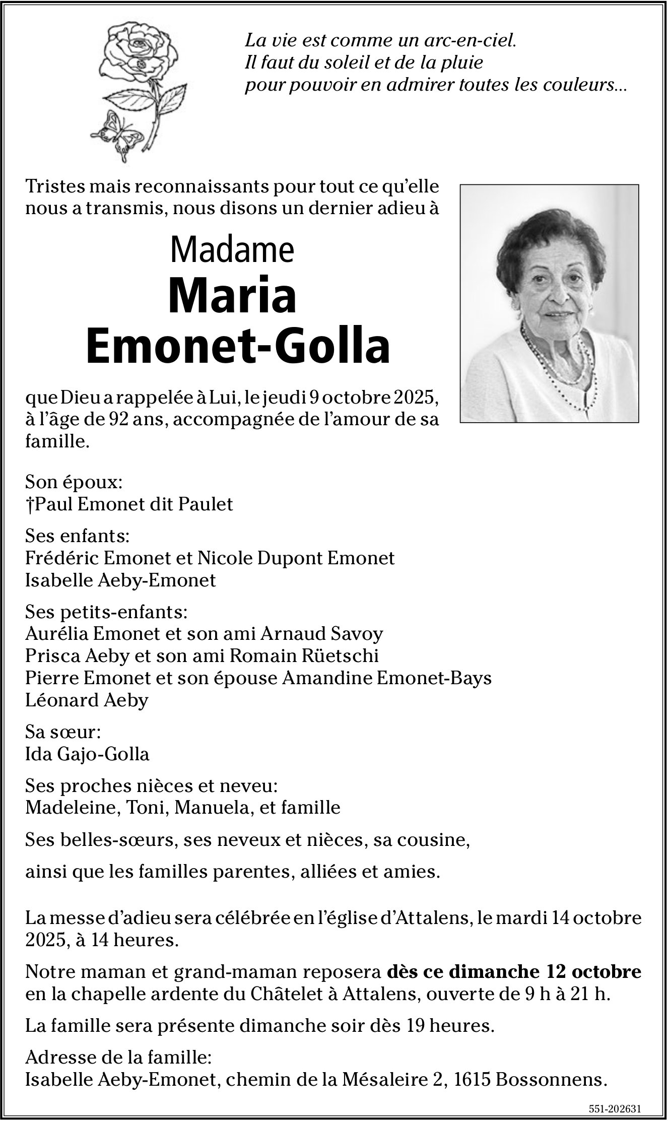 Avis de décès paru le 13/10/2025, décédé(e) à l'âge de 85 ans dans la région de Fribourg. La date de la cérémonie: 15/10/2025